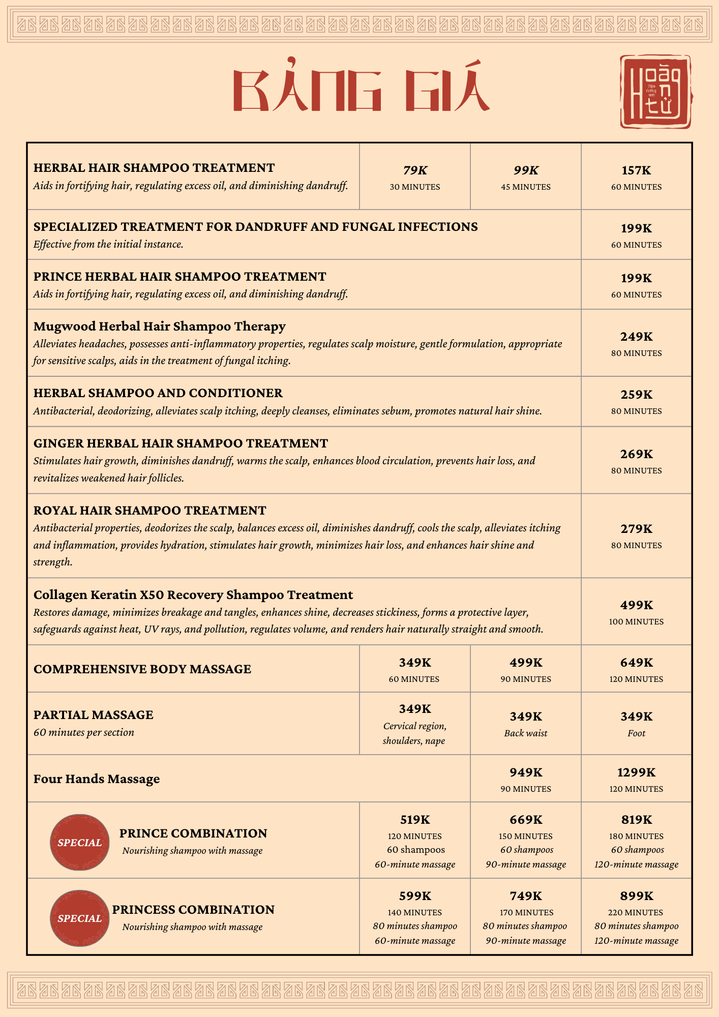 Escape the stress of daily life and immerse yourself in a sanctuary of relaxation at Hoàng Tử , where ancient Vietnamese herbal traditions meet modern therapeutic techniques. Our menu is meticulously designed to rejuvenate your hair, soothe your body, and calm your mind. Discover why we’re the top choice for gội đầu dưỡng sinh (wellness hair wash) and therapeutic massage in the region!